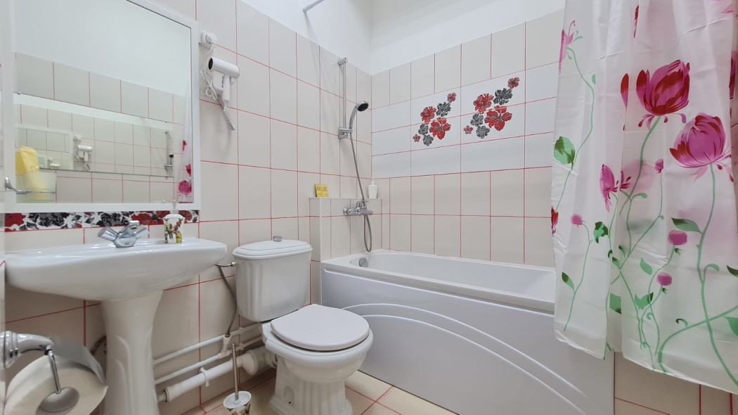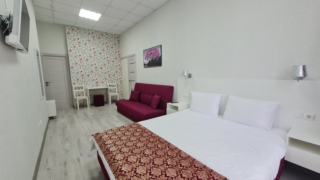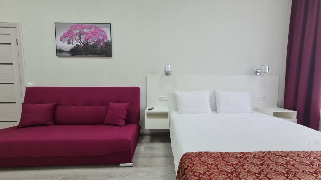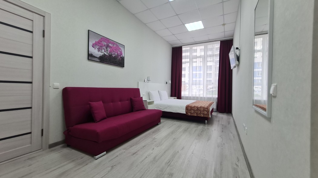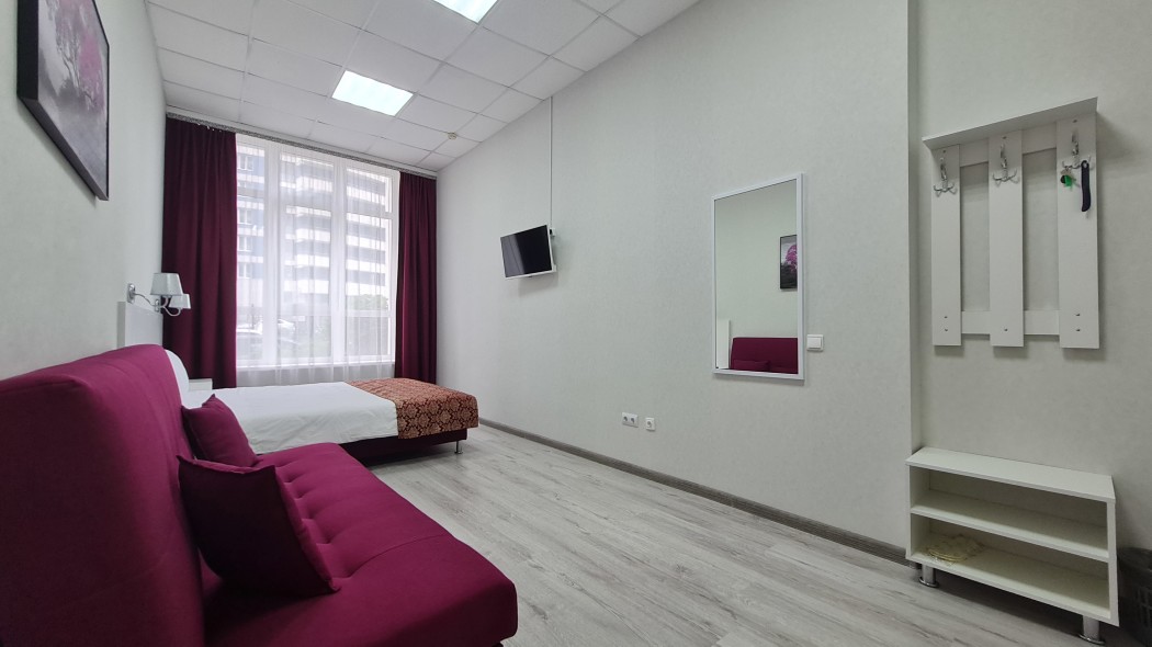 Светлый и уютный номер для молодой пары или семьи численностью до 4 человек. Большая кровать 160*200 и большой раскладной диван, который можно использовать в качестве дополнительной кровати для 1-2 человек. В номере есть все необходимое для комфортного проживания и отдыха в нашем городе. В номере есть шкаф для одежды, рабочая и обеденная зоны, а также телевизор с плоским экраном и технологией SMART TV. Чистое белое постельное белье и бардовые полотенца включены в стоимость проживания. Ванная комната в номере: ванна + душ, туалет, раковина. Площадь номера составляет 25 м2. Одноразовые: предоставляются гель для душа, шампунь, зубной набор, тапочки! Гости, проживающие в номере, имеют доступ к кухне, где можно воспользоваться холодильником, микроволновой печью, чайником.