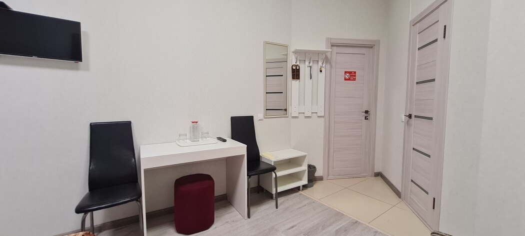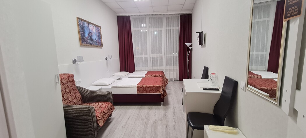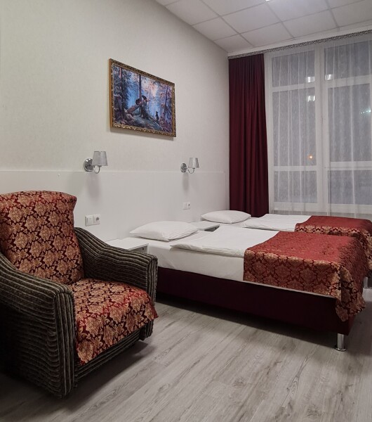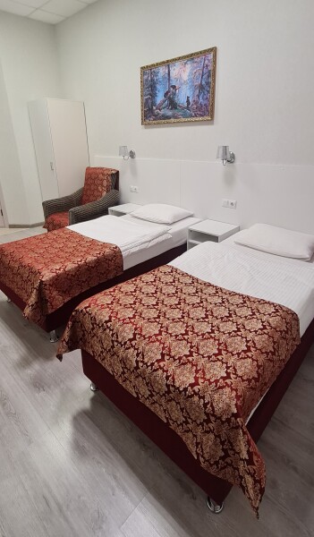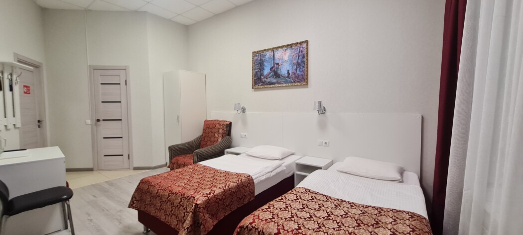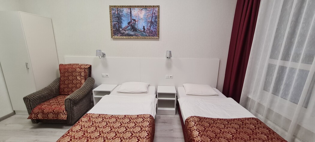 Стандартный номер с 2 односпальными кроватями 90*200, рассчитан на проживание двух человек. В номере есть всё необходимое, для комфортного проживания и отдыха. Кровати, кресло, шкаф для одежды, стол, стулья, тумба для обуви, вешалка для верхней одежды, большое зеркало, телевизор. Размер комнаты-20 м² В санузле: ванна или душ, умывальник с зеркалом, унитаз. Комплект чистого белого постельного белья и трёх бардовых полотенец входят в стоимость. Одноразовые: Гель для душа, шампунь, зубной набор, тапочки предоставляем!
